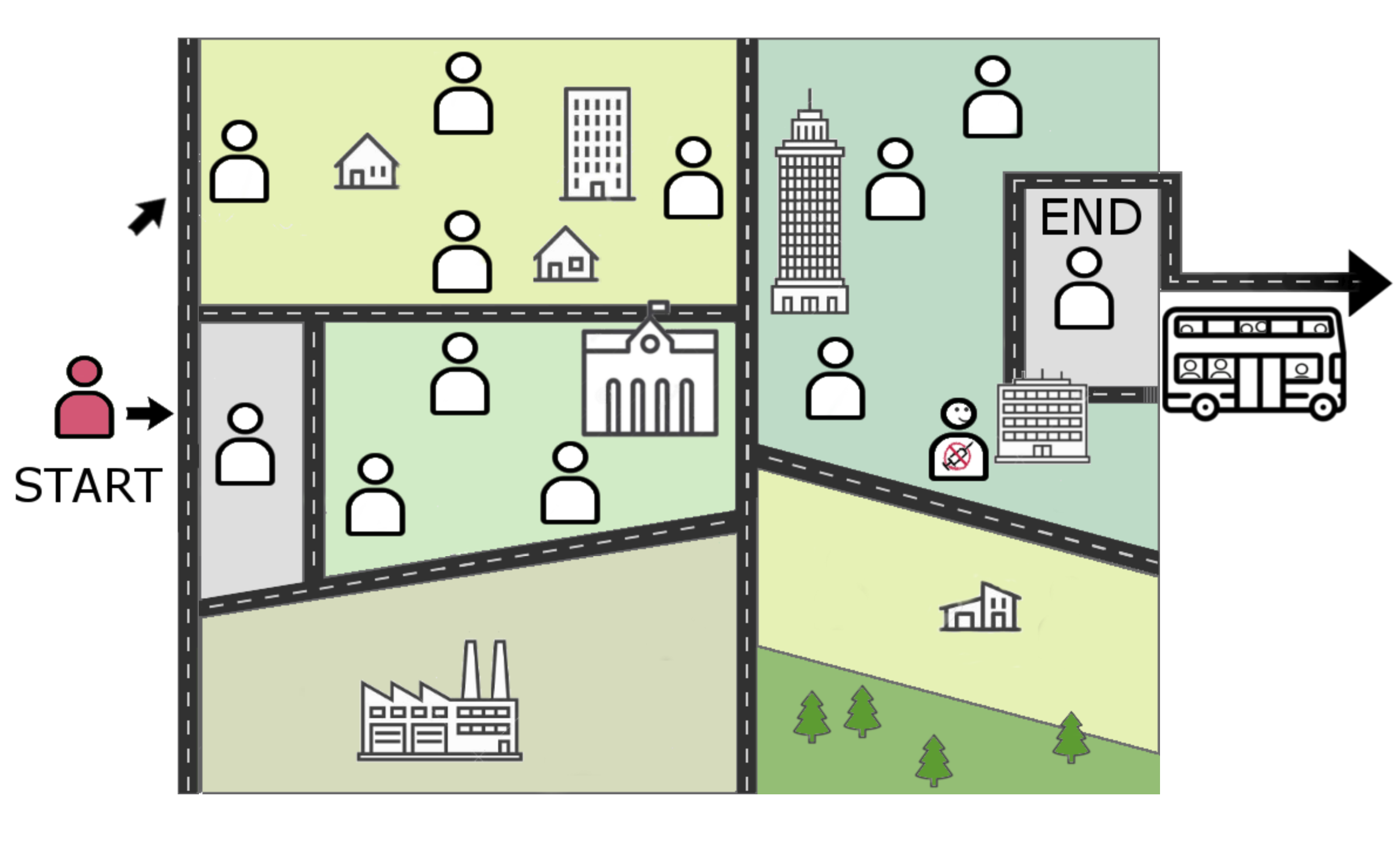 The town is divided by roads. You can chose which area to infect next by pressing on it.